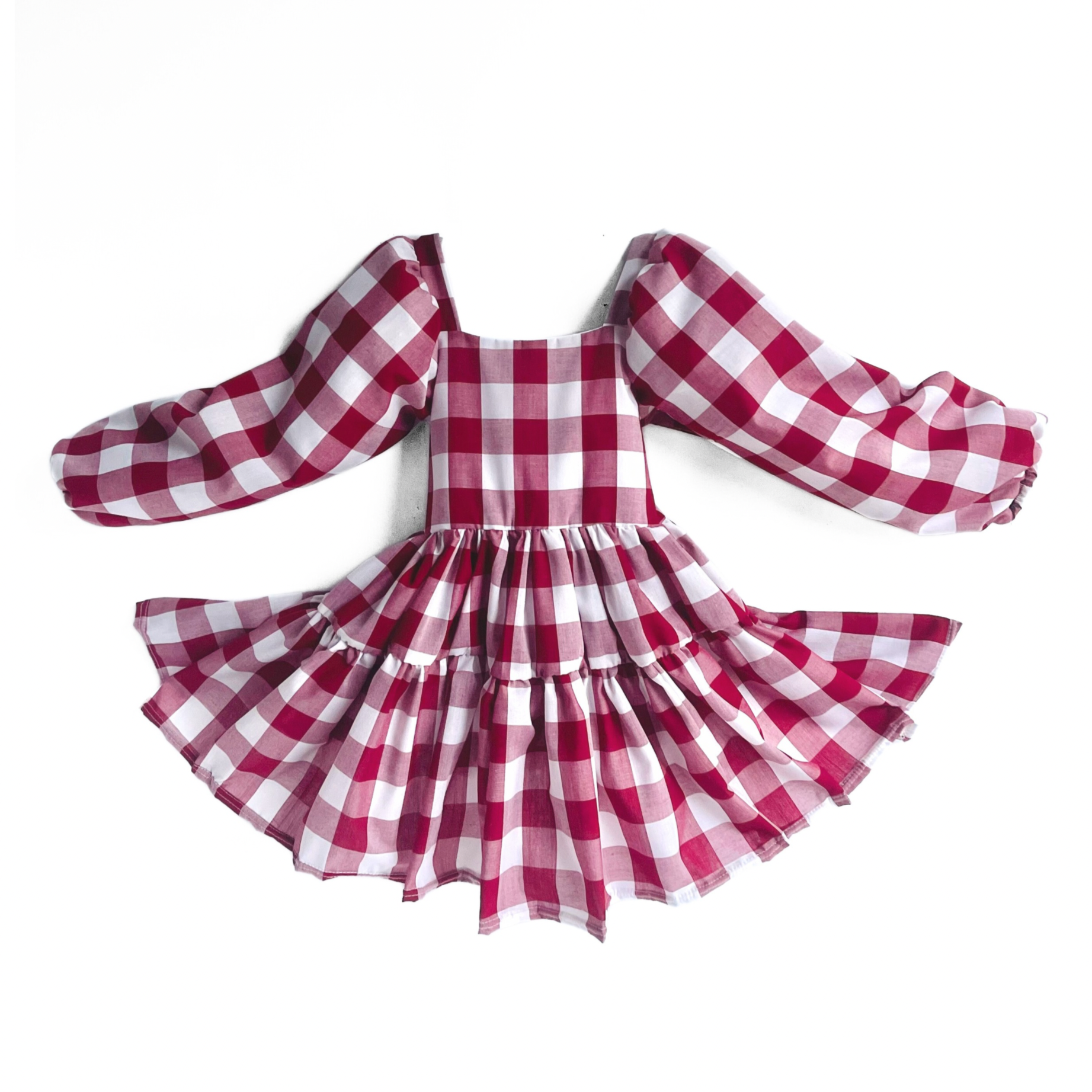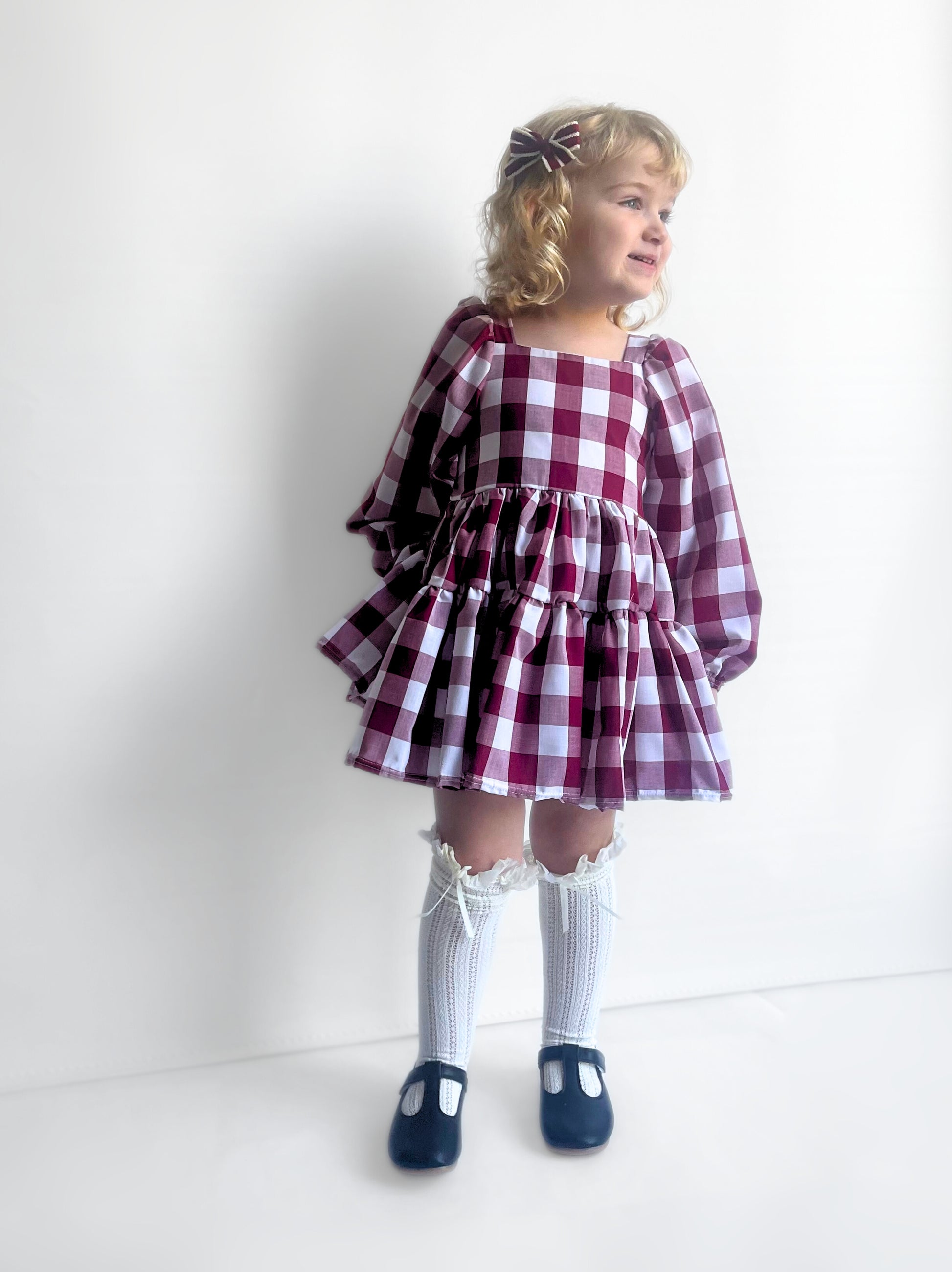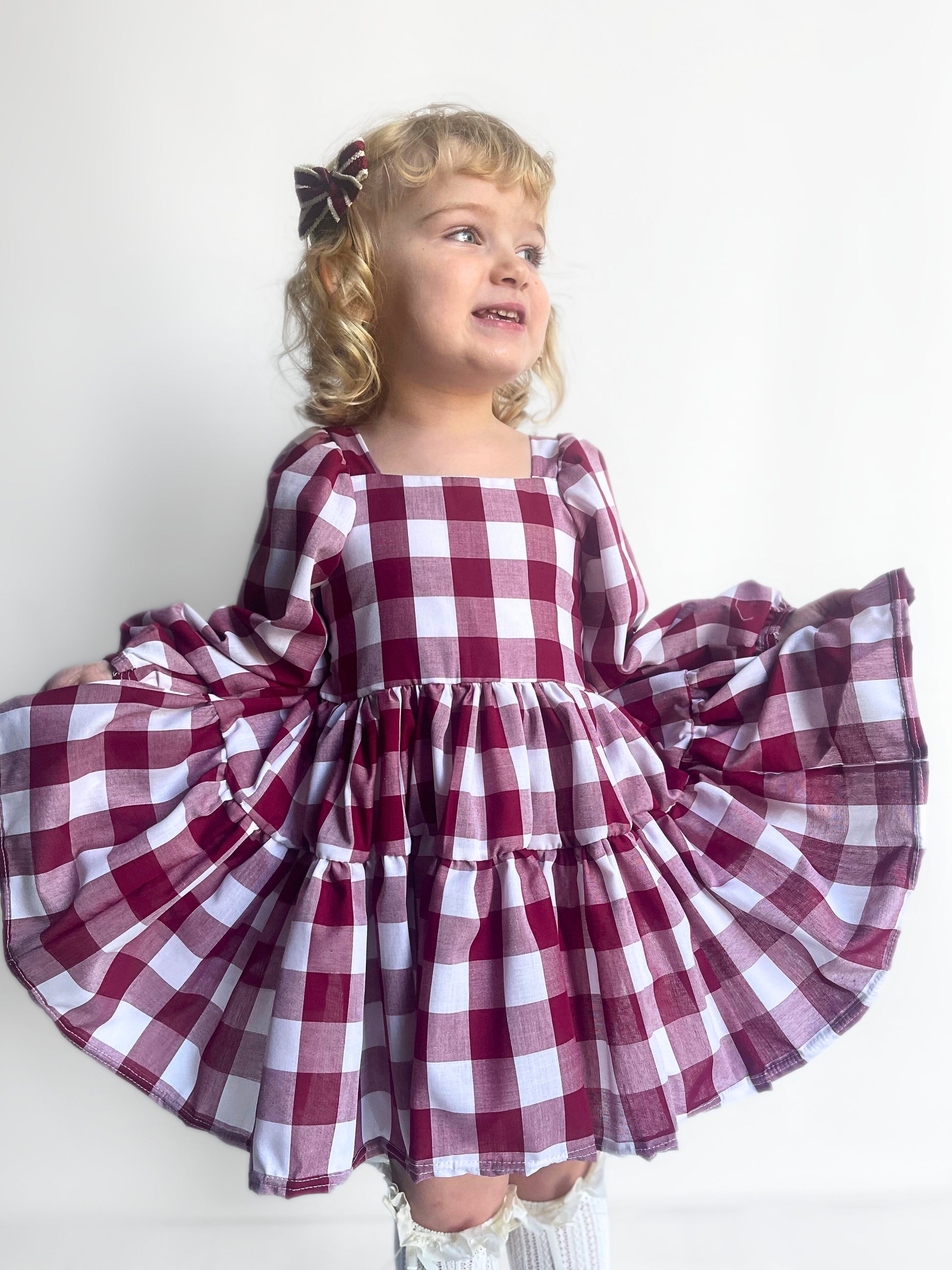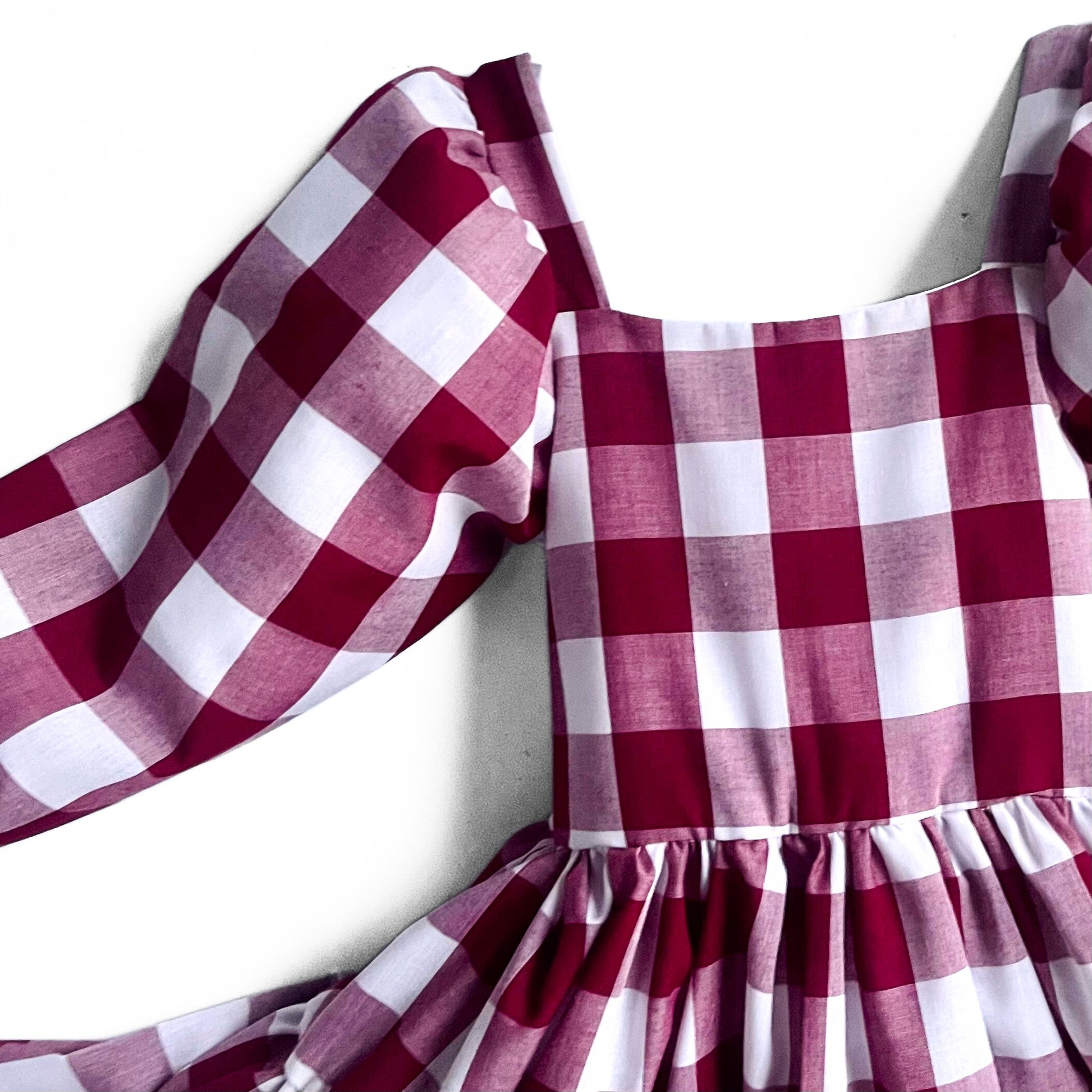 Berry Gingham Flutter and Bloom Dress with Balloon Sleeves