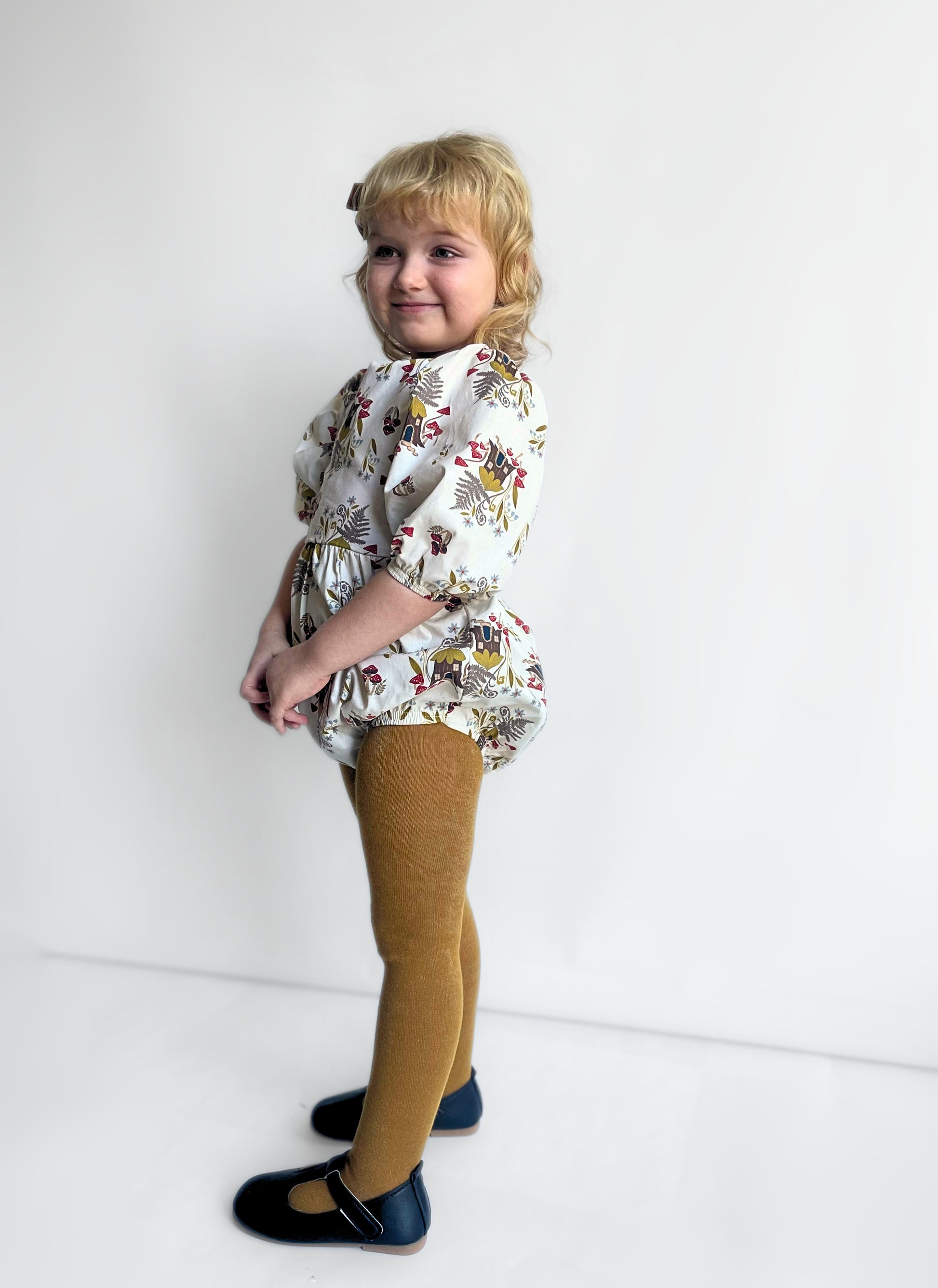 An adorable bubble romper featuring a whimsical tree house print with forest ferns and mushrooms on an off white organic cotton fabric.