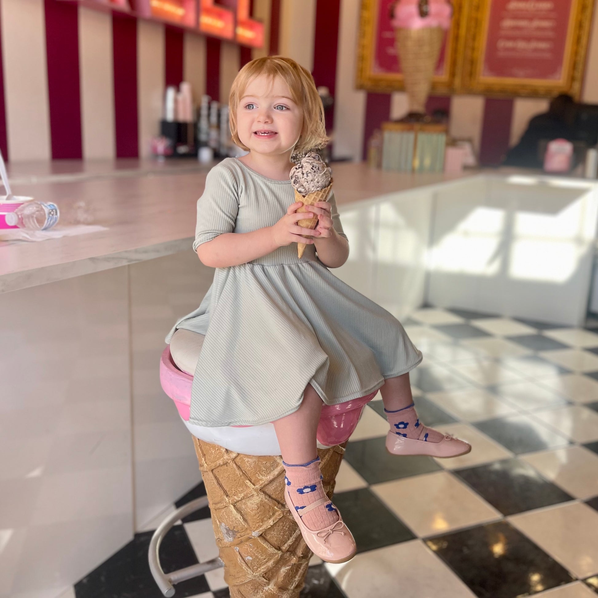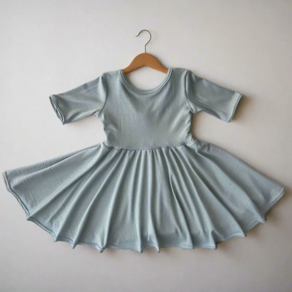 Introducing the perfect dress for whimsical girls who love to twirl! This lightweight ballerina dress in a charming mint green features a low back, playful half sleeves, and a full circle skirt designed for maximum spin. Crafted from stretchy rib knit fabric, it offers both comfort and style, making it ideal for parties or playtime. Made with 96% polyester and 4% spandex, and available in sizes 2 to 12. Made by hand with care.